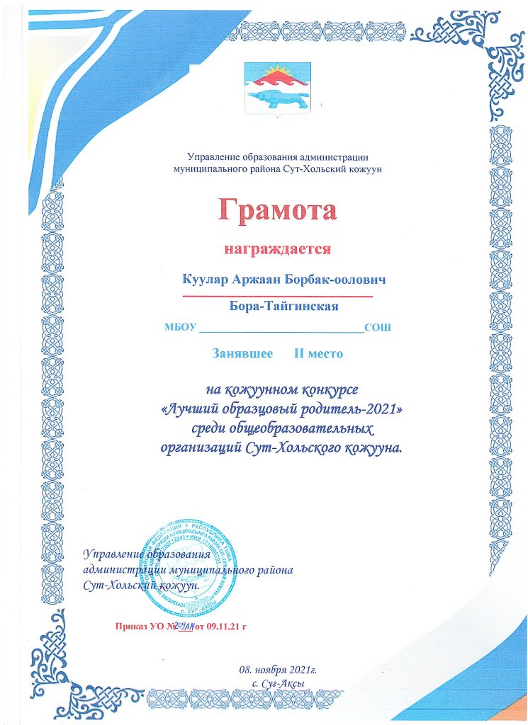 Без рубрики Призёры муниципального этапа республиканского конкурса «Лучщий образцовый родитель». Поздравляем наших родителей Куулар Сайзана Мартан-ооловну и Куулар Аржаан Борбак-ооловичу 30.11.2021 /
