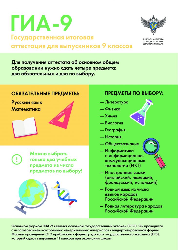 ГИА в форме ОГЭ и (или) ГВЭ включает в себя четыре экзамена по следующим предметам: экзамены по русскому языку и математике (далее – обязательные учебные предметы), а также экзамены по выбору обучающегося, экстерна (далее вместе – участники ГИА) по двум учебным предметам из числа учебных предметов, названных в Порядке проведения ГИА по образовательным программам основного общего образования: физика, химия, биология, литература, география, история, обществознание, иностранные языки (английский, французский, немецкий и испанский языки), информатика и информационно-коммуникационные технологии (ИКТ).